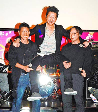 哈林(中)用工作療傷,昨發片記者會,好友張學友(左)、陳奕迅力挺同臺演唱