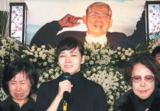 侯佩岑(中)父親侯世宏昨天公祭,侯佩岑代表家屬追憶父親生平,忍不住傷心落淚。
