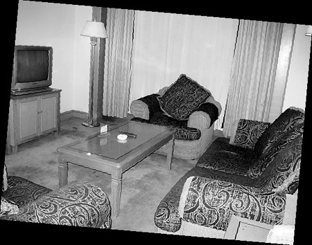 而在劇中和陳好演對手戲的“呂布”何潤東待遇就差點,和記者同住在影視城賓館,不過記者住的是標房,他住的是套房。記者剛入住時,服務員就熱情介紹:“最近這段時間,何潤東和陸毅都住在我們這里,他們都是老顧客了,很親切的,遇見我們都會朝我們微笑、打招呼。”何潤東所住的套房,每層只有一間,掛價一千元,打折后是388元。記者昨天進了11層的唯一一間套房——409房查看一番。