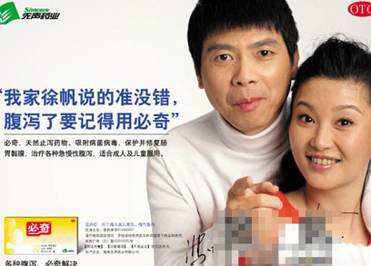 廣告中,徐帆讓馮小剛猜一樣物品,答案是××止瀉藥,而在該商品的站牌廣告上,馮小剛從背后摟著徐帆,旁邊的廣告詞寫著:“我們家徐帆說的準沒錯,腹瀉了要記得用××。”對于這個廣告,有消費者提出異議:“馮小剛是否在扮演消費者的角色,并鼓吹其藥品功用?”