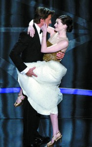 每一次頒獎嘉賓上臺前,一身正裝的杰克曼都會用一小段串聯詞引出頒獎嘉賓,當娜塔莉·波特曼和本·斯蒂勒上臺頒最佳攝影獎時,全場觀眾驚呆。大變臉的斯蒂勒戴著大胡子和墨鏡,完全看不出真面目。上臺后,波特曼忙著在一旁致詞,但斯蒂勒卻東張西望,自顧自地嚼著口香糖。波特曼終于忍無可忍了,“你竟然在嚼口香糖,快吐出來。 ”斯蒂勒故做緊張狀,把口香糖黏在桌上。隨后仍東張西望,注意力完全不在臺上,“輪到你發言了。 ”波特曼提醒道,沒想到斯蒂勒竟然拿 《貧民富翁》開涮,“我聽說《貧民富翁》是用手機拍攝的一部電影。 ”說罷,斯蒂勒竟拿出一部手機擺弄起來,待到波特曼介紹提名影片時,斯蒂勒又開始在舞臺上四處游走。