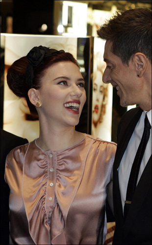 當(dāng)天的斯嘉麗·約翰遜身穿肉色復(fù)古上衫,配高跟鞋,加上招牌的夢(mèng)露式復(fù)古妝容,透得整個(gè)人水潤(rùn)亮白,十分性感豐腴。