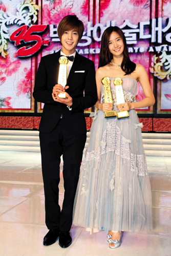 頒獎(jiǎng)典禮一開始,李民浩就毫無懸念地獲得電視類男子新人獎(jiǎng),F(xiàn)4的其他三名成員都起身祝賀他。而金賢重所在的組合SS501在頒獎(jiǎng)禮上獻(xiàn)唱《花樣男子》主題曲《因?yàn)槲姨怠芬约靶聦]嬛鞔蚋琛禪 R Man》時(shí),現(xiàn)場掀起了高潮。此外,最近憑借新歌《Gee》在歌謠界獲得巨大成功的“少女時(shí)代”組合也是當(dāng)天的人氣王,當(dāng)成員之一的允兒與金賢重一起獲得電視類人氣獎(jiǎng)時(shí),現(xiàn)場粉絲情緒越發(fā)高漲。金賢重領(lǐng)獎(jiǎng)時(shí)還大吼:“感謝你們!”他表示,從歌手跨界做演員,雖然很累但是遇到了好作品,覺得十分幸運(yùn)。