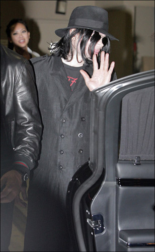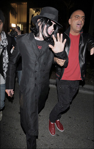 曾經的天王,曾經的巨星,曾經的富豪樂壇最重量級天王邁克爾·杰克遜在宣布拍賣自己的收藏品后首次露面,在設計師Christian Audigier的陪同下外出購物。天王不管走到哪里都有無數的狗仔隊跟蹤,當天的邁克爾·杰克遜身穿黑色禮帽,黑色風衣,黑色褲子黑色鞋子,帶黑色蛤蟆鏡,一身黑色更顯得容顏憔悴,皮膚蒼白,我們真的很懷念的那個曾經的天王。