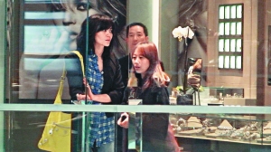王菲身穿黑外套、格仔恤衫,背Balenciaga手袋,現身連卡佛女裝部置裝。