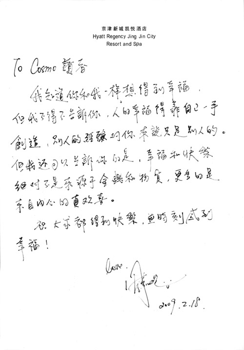 有做筆跡分析的朋友見過周慧敏的字。她寫道,她的字,是淑女之筆,品相和筆畫運勢上,都均勻而美觀,控制不夸張,足以見得周慧敏內心的穩定與成熟,懷抱著對一切美好的期許,或者遇到很多不如意,也還是堅持硬撐。