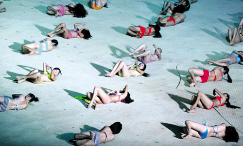 “印象沙灘”是整場演出中最“養眼”的一幕。剛開始,兩個穿著短裙的姑娘跑到舞臺中央,一陣狂舞之后,兩人突然豪放地當著全場觀眾的面,脫下短裙,露出性感的三點式泳衣。觀眾還來不及驚呼,更多的三點式美女出現了,先是十幾個,后來是上百個……滿場都是!她們朝著觀眾席大喊:“我們是海南島的姑娘!我們很年輕!我們很漂亮!” ……