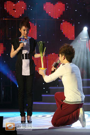 這位當紅的人氣偶像不僅迷倒了在場的觀眾,連“海豚王子”王櫟鑫都拜倒在林依晨的裙下,現場更是搞笑上演抱蔥求婚一幕。林依晨獻唱了《你》后,在特別環節中接受了演技大考驗,主持人即興要求林依晨表演“求婚”的橋段。這時,一旁的王櫟鑫按耐不住,自告奮勇上臺“求婚”。調皮的王櫟鑫手捧一顆大蔥,單腿跪下對林依晨深情告白:“親愛的晨晨,我知道你喜歡直樹,所以我送你一顆蔥。雖然我沒有你家直樹帥,但我會每天為你唱情,對你好,嫁給我好嗎?”惹得現場觀眾大笑不已,一邊的男主持人大左更是醋意大發,直言喜歡林依晨很久,也要向她求婚,不過大左的求婚禮物是非常具有長沙特色的臭豆腐。面對一大盤黑乎乎的臭豆腐,林依晨似乎被其獨特的氣味嚇到,捂著鼻子直呼“我還是選擇蔥吧!”場面十分搞笑,晚會氣氛也達到了高潮。