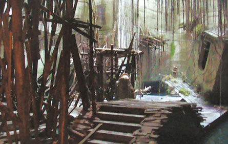 洞內(nèi)燈火通明,卻很陰冷潮濕,時不時聽到滴滴答答的水聲,十幾個工人正在忙碌著趕制道具。一位工人師傅告訴記者,“我們已經(jīng)在這里忙活兩個月了,洞內(nèi)的所有木頭橋、破房子、還有垂掛下來的藤條等等,全是人工打造的。”