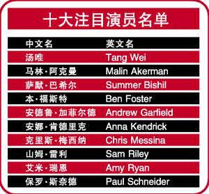 此次入圍十大注目演員的還有西部片《決斗猶馬鎮》的本•福斯特,他在影片中飾演反派羅素•克洛的手下,奸得令人心寒;之前,他還參演過《X戰警3》,飾演一名長有翅膀的戰警。此外,入圍的還有主演傳記電影《Control》的男主角山姆•雷利、本•阿弗列克導演處女作《失蹤人口》的女星艾米•瑞恩、與布拉德•皮特同臺演出《刺殺神槍手》的保羅•施奈德等。