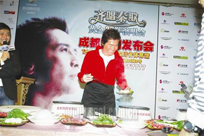 昨日新聞發布會的主題似乎是火鍋,而不是音樂。但其中的真意,齊秦非常明了:“這樣舉辦新聞發布會,是想以朋友的方式和大家聊聊。在四川我做辣味火鍋拼不過你們,那我就做一個來自馬來西亞的胡椒螃蟹火鍋吧。”齊秦系上了圍裙,他面前擺滿了蟹肉、粉絲、肉丸子、蚌殼、蔬菜等燙料,5口蒸鍋正熱氣騰騰地翻滾著湯汁。曾經在舞臺上激烈地高歌《九個太陽》、《啞口》,曾經長發不羈的齊秦,曾經在與王祖賢的愛情糾葛里被傳說得沸沸揚揚的齊秦,昨日像足了一個居家的男人。他非常安然:“我是蠻居家的,我在成都剛剛買了房子,還想開火鍋店,我喜歡成都。”