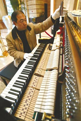 調(diào)音師正在為“郎朗”鋼琴調(diào)音。