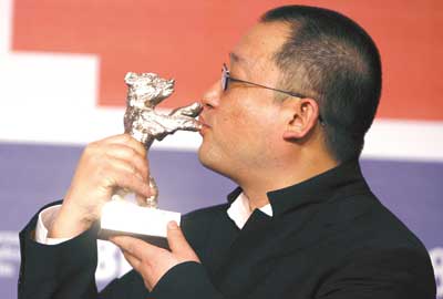 《左右》拿了銀熊獎(jiǎng),連導(dǎo)演王小帥都沒(méi)有想到。頒獎(jiǎng)臺(tái)上,評(píng)委戴安·克魯格把銀熊遞到王小帥的手里。王小帥先是給了評(píng)委克魯格一個(gè)禮貌的擁抱,然后把銀熊舉到左邊與臉相平的位置,輕輕一吻。時(shí)間定格在這一刻,王全安在柏林、李安和賈樟柯在威尼斯,用的都是同一種姿勢(shì)親吻代表最高榮譽(yù)的獎(jiǎng)杯。