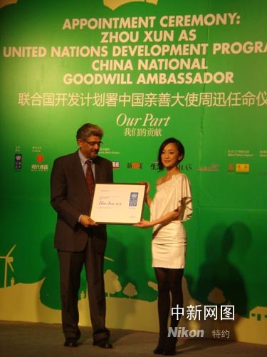 藝人周迅當選首位聯(lián)合國開發(fā)計劃署中國親善大使