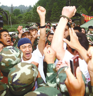 四川大地震災情讓眾多演藝界人士牽掛,昨日,由劉德華、鄭秀文、容祖兒、張國立、陳道明、馮小剛、蔣雯麗等十幾人組成的明星團,來到災區都江堰向峨鄉,慰問救災前線的子弟兵和部分災區民眾。每到一處駐地,戰士們都備受鼓舞,大家互相加油打氣,一聲聲“加油”的喊聲響徹天空。