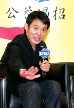 中新網(wǎng)6月3日電 據(jù)臺(tái)灣“東森新聞”報(bào)道,功夫巨星李連杰這次到臺(tái)灣不宣傳電影,他推廣的是一元行善;2日晚間他走進(jìn)政大EMBA講堂,在臺(tái)灣的企業(yè)精英和教授面前,足足說了兩個(gè)小時(shí),而且他有問必答,風(fēng)趣的言談成功的把一元行善的想法,介紹給在場的政大師生。
