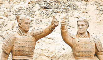 廣告中,古天樂和黃曉明扮演了兩位秦朝將軍,根據(jù)劇情主辦方同時(shí)制作了兩尊真人大小的兵馬俑。記者昨日從香港百事公司負(fù)責(zé)人處了解到,廣告拍攝的當(dāng)天,是一場敵軍對殺場面,放在一旁的兩尊人像沒有專人把守,給了小偷以可乘之機(jī)。一共有8個(gè)人,趁著劇組無人理會(huì)他們,就悄悄溜了進(jìn)來,抬起石像就向外面開溜。