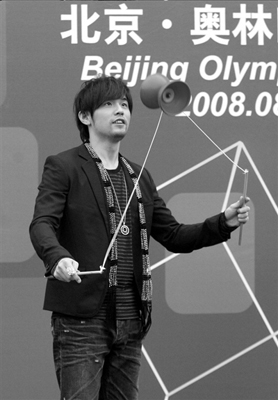 昨天,周杰倫、潘瑋柏和S.H.E一起現身奧運中心區,參加某品牌商家展館的開館儀式。主辦方安排了雜技、京劇等演出,周杰倫一時手癢,上前與雜技演員們切磋空竹技藝。