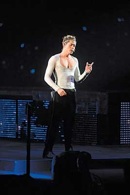 對于絆腳險跌,郭富城說在架上表演有一定危險程度,但幸好自己孔武有力未有受傷。說到郭富城的結實胸肌,他指為拍電影《風云II》而增磅,完成后又為演唱會減掉5磅,他說:“覺得沒兩全其美,我已每日跑步做運動收小肌肉,自覺可瘦點,但工作人員覺得我不要再瘦,現在是剛好。”