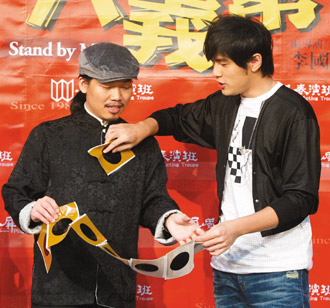 好友方文山(左)初試舞臺劇,周杰倫(右)昨天親自到場加油打氣,并贈跌打損傷膏藥當禮物。