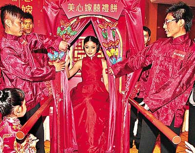 陳慧琳昨以新嫁娘打扮,乘轎進場為喜餅廠商宣傳。