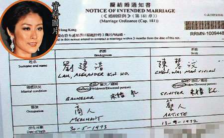 中新網(wǎng)9月17日電 香港媒體報(bào)道,陳慧琳(Kelly)和未婚夫劉建浩(Alex)拍拖16年,終于結(jié)束愛(ài)情長(zhǎng)跑,兩人將于下月2日拉埋天窗,并于洲際酒店筵開(kāi)55席宴請(qǐng)親朋。昨日在金鐘婚姻登記事務(wù)及紀(jì)錄辦事處,張貼了Kelly和Alex的擬結(jié)婚通知書(shū),當(dāng)中寫(xiě)上Kelly的真名“陳慧汶”及她身份證原用的英文名“Vivian”,而原來(lái)Alex的英文全名是“Alexander”,不過(guò)多年來(lái)外界已習(xí)慣簡(jiǎn)稱(chēng)他做“Alex”。通知書(shū)上也列出Kelly和Alex的出生日期,Kelly是72年9月,而Alex則是73年5月,Alex比Kelly差不多小一年。