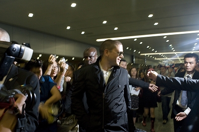 米勒乘坐從舊金山飛往上海的UA857航班在晚點半小時后,終于在17點50分降落在浦東國際機場。當告示牌顯示“到達”時,守候多時的粉絲一陣歡呼,而媒體也開始拿起相機準備拍下米勒現身的一刻。不過這一等就是近一個小時,米勒在18點40分才出來。在這期間,米勒先是換上品牌商提供的黑色外套,然后就是取行李,還有就是等待接待方的安排。