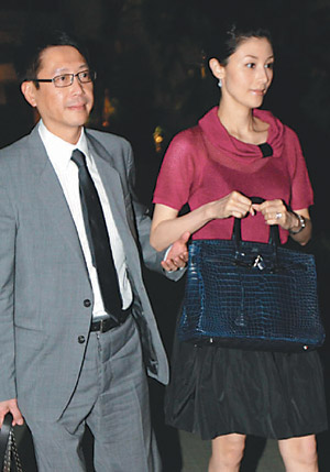 李嘉欣(右)提著愛瑪仕包,和許晉亨在香港現身,李嘉欣左手上6克拉鉆戒亮閃閃。