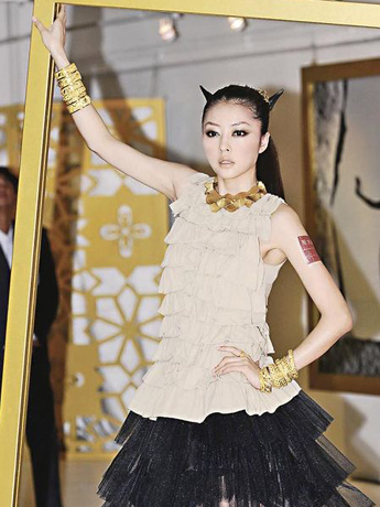 熊黛林“魔女”形象展示金飾品。香港《明報》圖