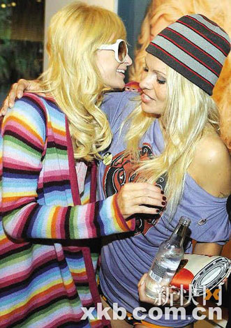 她身穿藍色T恤,香肩半露,下身僅穿三角褲,站在裸體艷女畫像前大擺pose,席間與“豪門欲女”帕麗斯·希爾頓親密相擁打招呼。