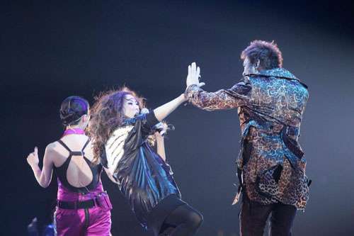 鄭秀文(中)與許志安(右)在臺上擊掌鼓勵