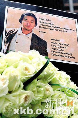 張國(guó)榮(哥哥)的歌迷昨天在香港文華東方酒店外舉行悼念活動(dòng),紀(jì)念哥哥去世六周年。事發(fā)地?cái)[滿歌迷自發(fā)送來(lái)的各式鮮花。3月31日上午11時(shí)開始,便有歌迷從上海、臺(tái)北,日本、美加、英國(guó)、澳大利亞等地趕到文華東方酒店向偶像悼念,并送上心形花牌給哥哥。