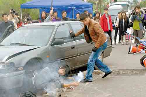 最驚險的一幕是車輛爆炸之時,雖然整部汽車都燃起了熊熊大火,卻未出現零件炸飛的情況。爆炸的道具十分簡單,是劇組自制的“汽油彈”———在幾個空瓶內裝滿汽油,外加少許甲胺磷農藥或白酒等物品,與幾個小“魚雷”捆綁在一起就能“爆炸”了。(記者 章琰)