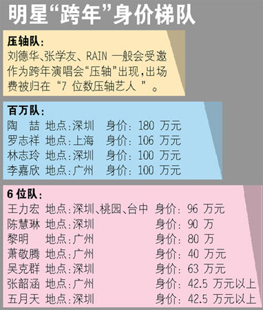 由于圣誕和元旦雙節(jié)即將到來,港臺(tái)和內(nèi)地明星馬上又要迎來一年一度的搶錢“尖峰時(shí)刻”。往年,臺(tái)灣地區(qū)的明星基本以島內(nèi)“串場(chǎng)”為主, 元旦除夕晚從臺(tái)北一路南下,一個(gè)晚上坐飛機(jī)或直升機(jī)趕場(chǎng)賺錢。但今年起,大陸各大衛(wèi)視的跨年演唱會(huì)“搶星大戰(zhàn)”升級(jí),為港臺(tái)明星大開“錢”途。僅北京、上海、廣州、深圳等幾大城市舉辦的跨年秀已讓港臺(tái)明星跑到腳軟,且這些電視臺(tái)開出的價(jià)格大大高出臺(tái)灣或者香港同樣活動(dòng)的報(bào)價(jià),因此內(nèi)地地區(qū)的跨年活動(dòng)明顯更有吸引力。