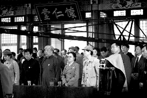 11時許,委員們攜手走進了基地內仿制的“中南海懷仁堂”,這里的道具都是模仿當年的真實場景設置,包括桌上的水杯、文件封面。邁進“會場”,大家表情嚴肅了許多,已連續3屆當選政協委員的徐定茂回憶,自己第一次走進人民大會堂履職時,心情也非常激動,“第一屆會議具有特殊意義,可想當年委員們的心情。”在導演的指揮下,委員們落座,投入“默哀”、“選舉”等場景的拍攝中。記者傅沙沙