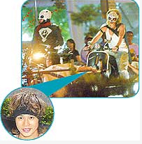 臺(tái)灣“蘋果日?qǐng)?bào)”消息,《熊貓人》2名男主角都是周董力挺的好友宇豪與彈頭,女主角則是“新版J女郎”江語晨,全是一家親。該劇日前在大直美麗華取景,他們戲服頗有卡通味,其中彈頭白汗衫配披風(fēng),頂著金毛佩戴熊貓面具,不像“熊貓人”,反倒像“金毛獅王”,騎的是復(fù)古偉士牌機(jī)車;相較之下,與他對(duì)戲的演員身穿特制的熊貓俠裝,騎的是周董山寨版蝙蝠機(jī)車,看起來還比較像真正的熊貓人。