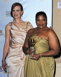 雖然妮可·基德曼近年來屢屢被冠以“票房毒藥”的惡名,但她從來都是各大頒獎禮上的耀眼之星。妮可穿了一身單肩小花白色長裙,左胸下有發散出來的垂褶。她是頒獎禮上第一個上臺頒獎的嘉賓。雖然妮可的白色單肩禮裙很美,但她一上臺就為自己沒穿黑色裙裝向海地地震的死難者默哀表示歉意,并且宣傳了網絡捐款渠道和喬治·克魯尼最近發起的捐款行動。