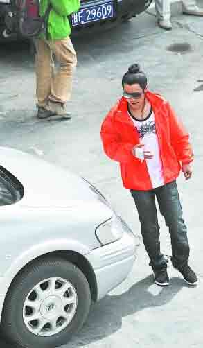 小沈陽穿著一件鮮亮的橙色外套,里面是一件隨意的白色T恤,臉上已經化好妝,戴著墨鏡,而不是大家常見的黑框眼鏡,乍一看還真有點認不出來。小沈陽的古裝頭套已經戴好,只是一個簡單朝上梳的發髻,不過鬢角兩側還特地留了兩縷長長的頭發。記者一眼就發現,小沈陽的右手不自然地舉在小腹前,還用白色的紗布進行了包扎,肯定是受傷了。不過小沈陽的心情看上去好極了,他先是哼歌,后來見記者追問拍戲感受,他便取下墨鏡,反問記者是哪里人,不過面對“第一次和張導拍戲的感覺怎么樣”的問題,小沈陽只是微笑,并不回答。