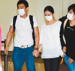 晚10時半左右,劉、朱飛抵香港,上百媒體及fans“急撲”機場一探究竟。當閘口打開,遭媒體圍攻的華仔不愿松開朱麗倩的手并一起步出機場,為保護朱麗倩不被人群撞倒,華仔更騰出另一只手摟著朱麗倩,二人寸步不離,非常恩愛。接著,華仔與朱麗倩在幾名保安及警員保護下匆匆離開,不過由于場面極度混亂,其間不時有人跌倒及出現掉鞋子的狀況。