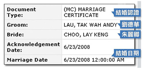 華仔與朱麗倩在賭城結婚注冊的結婚認證也曝光,結婚日期是2008年6月23日。
