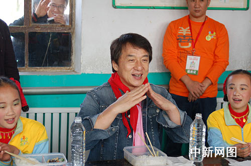 臨近午飯時分,成龍與十幾名小學童每人領到了一盒香菇炒油菜和白米飯的盒飯,在一間簡陋的教室里津津有味地吃了起來。雖然是頭一次與國際巨星成龍在一起吃飯,可這些鄉村娃娃卻一點也不怯場,好奇心驅使他們左一個問題右一個問題問個不完。而成龍卻面帶笑容地邊吃邊聊,將他的成長經歷和成功經驗耐心地一一解答。眾學童聽完后,紛紛夸“成龍叔叔好棒啊!”