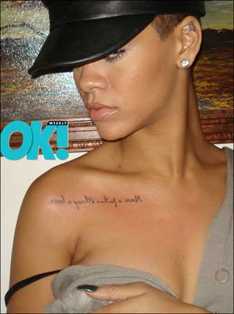 美國歌壇數一數二的潮流小天后蕾哈娜在自曝自己的手槍紋身后,再度在自己的博客中登出了全新的紋身!癗ever A Failure, Always A Lesson”這就是這位小天后在自己的鎖骨處的新紋身上面的一句話?不知道蕾哈娜想要告訴我們什么呢?