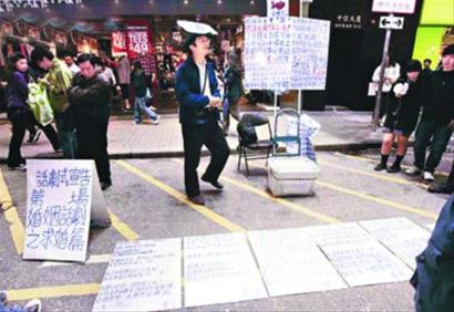 日前,在旺角行人專用區,一位中年男子在頭上圍上“我愛容祖兒公主”的紙牌,帶著紅白藍膠袋、兩張折椅等做道具,當街展示多張求愛紙牌。