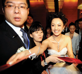 天后王菲的駕到,使得這場婚禮頗具轟動效應(yīng),也許是王菲的星光太過耀眼,以至于隨后新郎和新娘、伴郎張楊、伴娘薛佳凝的露面都有些暗淡。