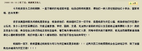在2008年地震發(fā)生后,北京的同事接到子怡捐100萬的指示后,他們分別給紅十字會捐了兩筆錢。我們當時都不在國內(nèi),我也沒盯這事。但在最近兩個星期看到媒體報道說捐款總數(shù)沒有達到100萬,我便開始調(diào)查此事。當我尋找捐款收據(jù)時,才發(fā)現(xiàn)一直沒有。今天紅十字會告訴我,捐款的收據(jù)一直在紅十字會那邊,因為他們沒有寄出收據(jù)的地址。當我了解到收據(jù)細節(jié)時,才確認了善款只有84萬元。同時再了解到當時會計和另一個同事她們在各自匯出金額上出現(xiàn)了紕漏,都以為對方匯出了差額。