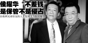 前天凌晨兩點,一位名叫王魏東至的網友第一次發表博文,大談其對“侯耀華是否侵占財產”的見解。此人自稱是侯家兩兄弟的朋友,與二人都有來往。他稱侯耀華不會侵占財產,理由有三點:第一,侯耀華資產過億,根本“不差錢”。他表示侯耀華收藏的名表、字畫、寶石等藏品并不比弟弟少,加上各地房產怎么也有幾千萬元;第二,侯耀華為人大方,喜歡送訪客禮物。所送禮物有“手表、打火機、鋼筆、戒指等”,有時還會將訪客和自己的名字刻上去作紀念;第三,侯耀華曾寫過名為《倒霉必讀 演義人生》一書,可見其人生態度。最后他表示,侯耀華“肯定是為弟弟保管遺產,而被侄女誤解成侵占”。