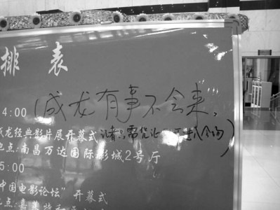 但有趣的是,記者們在電影節“指定酒店”的大堂信息欄發現了這樣一行大字:“成龍有事不會來。 ”記者們看后紛紛大笑,并用相機拍下了這個有意思的畫面,這句話也迅速成為記者圈內的一句流行語。記者 于音