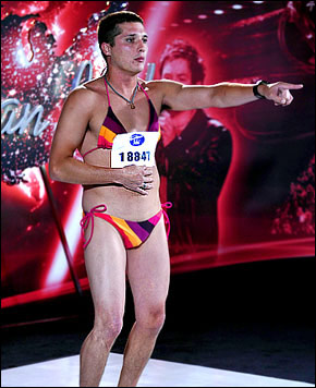 《美國(guó)偶像》從來(lái)不乏惡搞歌手,去年出了個(gè)比基尼女孩,今年又出了個(gè)比基尼猛男。周二晚,在節(jié)目進(jìn)行過(guò)程中,參賽選手泰·海默靈(Ty Hemmerling)身著比基尼泳衣登臺(tái)獻(xiàn)唱,驚得眾評(píng)委目瞪口呆。