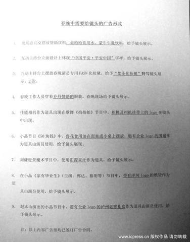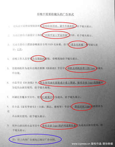 新民網3月2日報道 2010年3月1日,北京,央視虎年春晚廣告植入清單曝光,列出內容次數、注明已簽合同,春晚當天需要給鏡頭的廣告形式都一一羅列,包括飲用水、化妝鏡、服飾、相機、酒等名目繁多。