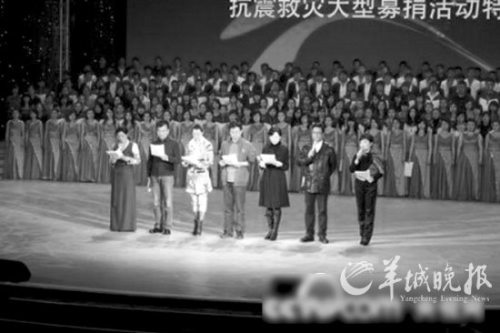 昨晚8時,《情系玉樹 大愛無疆———抗震救災大型募捐活動特別節目》在中央電視臺現場直播,約有300名來自內地和港、澳、臺地區的老藝術家、體育明星、戲曲歌唱演員參與演出。與普通的晚會不同,這次央視將節目現場與新聞現場串聯,按照震后的時間順序,穿插救援畫面,再現了震區每天發生的感人事件,突出了節目的紀實性。